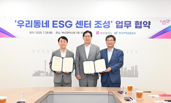 [아유경제=조명의 기자] 부산광역시는 이달 28일 시청 국제의전실에서 한국주택금융공사(HF)와 `우리동네 사회가치경영(ESG) 센터` 조성을 위한 업무협약과 기부금 전달식을 개최했다고 밝혔다.