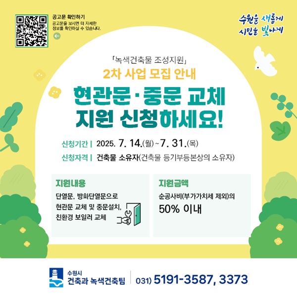 최근 수원시는 오는 31일까지 `2025년 녹색건축물 조성 지원사업`의 2차 참여자를 모집한다고 밝혔다.