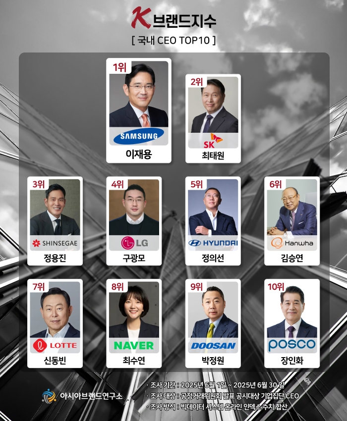 이번 K-브랜드지수 CEO 부문은 공정거래위원회 발표 공시대상 기업집단 CEO를 대상으로, 2025년 6월 1일부터 6월 30일까지의 온라인 빅데이터 2억 388만 5819건을 분석했다.