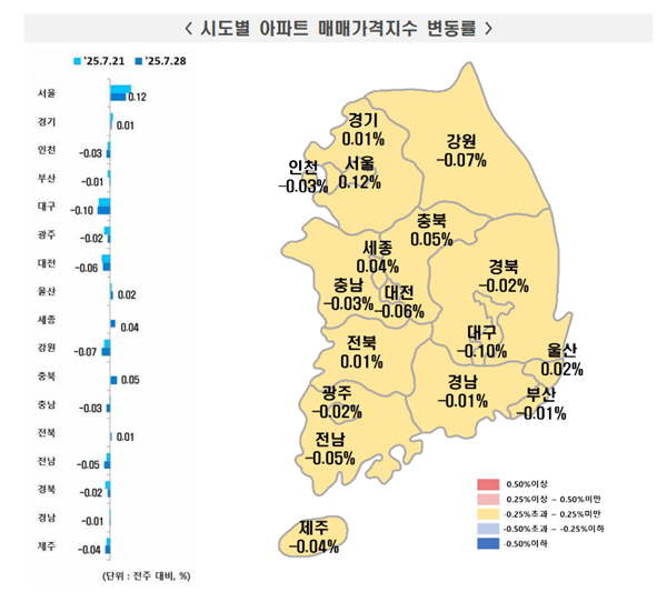 [아유경제=권혜진 기자] 최근 한국부동산원이 발표한 `주간아파트 가격동향`에 따르면 2025년 7월 4주(지난 7월 28일 기준) 전국 아파트값은 상승(0.01%)을 기록했다. 수도권과 서울은 상승폭 축소, 지방은 하락폭 축소한 상황이다.