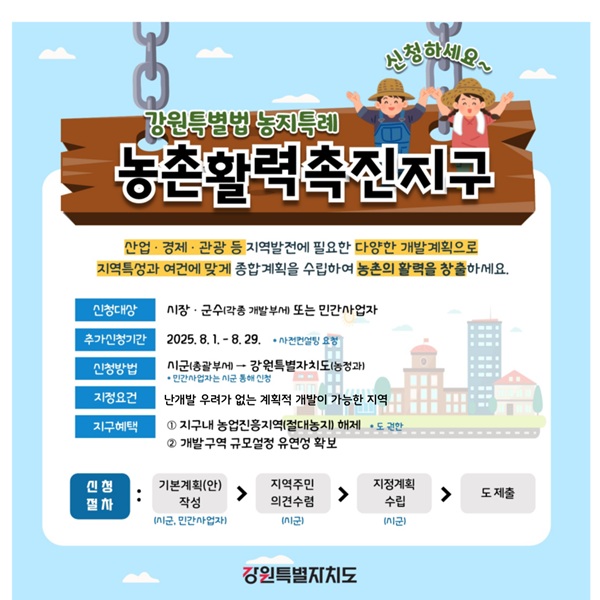 [아유경제=오수영 기자] 강원이 농촌활력촉진지구 지정 활성화를 위해 최소 지정면적 규정을 삭제했다. 이로써 소규모 농지 개발이 확대될 전망이다.