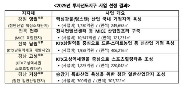 투자선도지구 사업지로 지정된 강원 영월, 전북 전주ㆍ남원, 경남 고성ㆍ거창 5곳은 지역 경제의 중심이 될 성장거점으로 육성된다.