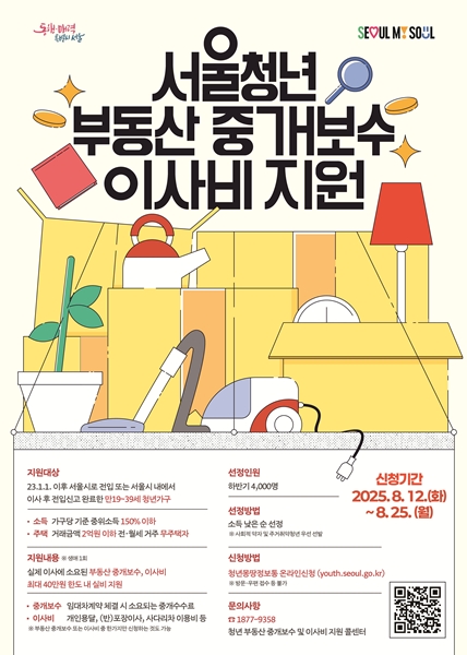 [아유경제=조명의 기자] 서울시는 하반기 청년 부동산 중개보수 및 이사비 지원사업 신청자를 모집한다고 이달 11일 밝혔다. 이사가 잦고 상대적으로 주거환경이 열악한 청년들의 부담을 덜어주기 위해서다.