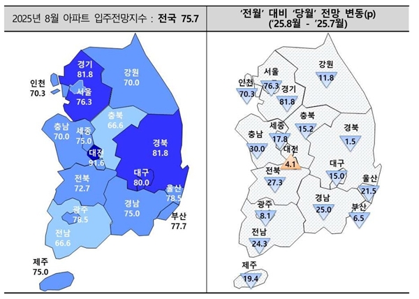 수도권은 76.1로 전월(117.1)과 비교해 41p 하락했다. 서울은 76.3으로 전월(121.2)보다 44.9p 내렸다. 인천은 70.3으로 전월(111.5)보다 41.2p, 경기는 81.8로 전월(118.7)보다 36.9p 각각 하락했다. 수도권 입주전망지수는 지난달(7월)에 2024년 11월 101.9 이후 8개월 만에 100을 웃돌았으나 한달 만에 다시 기준선 아래로 급락했다.