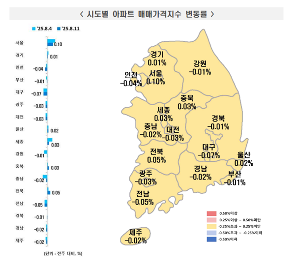 [아유경제=권혜진 기자] 최근 한국부동산원이 발표한 `주간아파트 가격동향`에 따르면 2025년 8월 2주(지난 11일 기준) 전국 아파트값은 상승(0.01%)을 기록했다. 수도권과 서울은 상승폭 축소, 지방은 하락폭 축소한 상황이다.