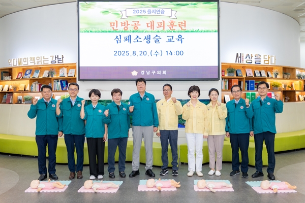 이번 민방공 훈련은 공습 상황을 가정한 모의훈련으로, 초동 대처 능력 강화와 비상시 국민행동 요령 습득을 목적으로 실시됐다. 강남구의회 의원들은 오후 2시 발령된 공습경보에 따라 경계 태세를 유지하며 강남구민회관 1층 대피장소로 이동했다. 이어 심폐소생술 및 응급처치 교육에 적극적으로 참여하며 훈련을 마무리했다.