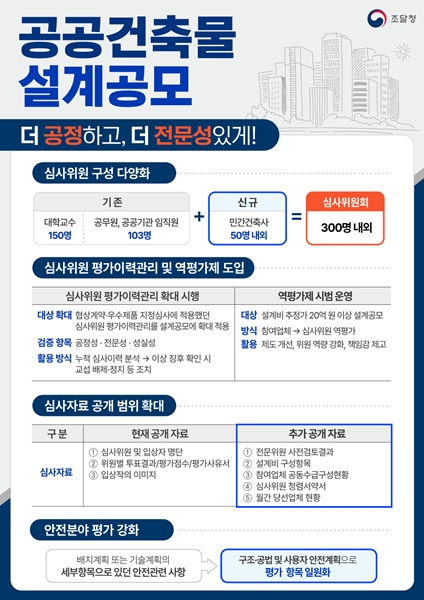 또한 전문위원 사전검토결과, 설계비 구성항목, 참여업체 공동수급 구성 현황 등 심사과정의 자료공개 범위를 확대해 투명하고 공정한 경쟁 환경을 제공한다.