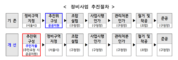 2010년 도입한 공공지원(舊 공공관리)제도는 구청장이 시비 보조금을 받은 후 용역을 통해 추진위를 구성하는 방식이다. 이 경우 공정성과 투명성이 보장돼 주민 갈등을 줄일 수 있지만. 보조금 교부와 용역 발주 등 행정 절차 이행에 상당한 기간이 소요돼 신속한 추진위 구성에 어렵다는 문제가 있었다.