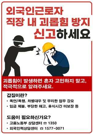또 외국인 근로자가 지원제도를 쉽게 활용할 수 있도록 고충 상담센터 이용과 참여 방법 등을 작업 전 안전점검회의(TBM) 시간에 안내한다. `괴롭힘 방지 신고 포스터`를 다국어로 제작해 현장에 부착하거나 개별 근로자에게 온라인으로 배포하는 등 자체 예방 활동도 병행할 계획이다.