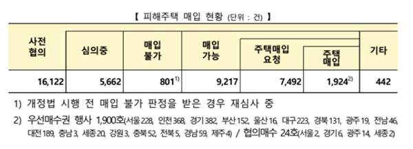 지난 8월 26일 기준으로 피해자로부터 총 1만6122건의 피해주택 매입 사전협의 요청이 들어왔으며, 이 중 9217건은 현장조사 등 매입심의가 끝나 피해자에게 매입이 가능 사실이 통보됐다.