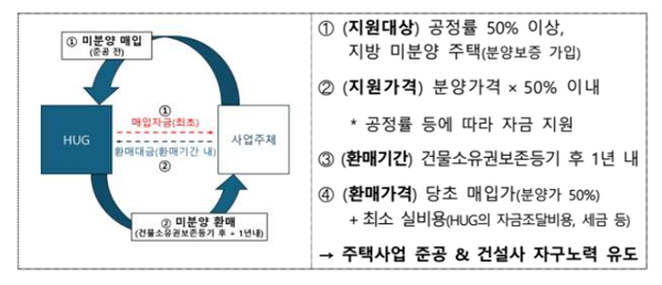 안심환매사업은 공정률 50% 이상의 지방 소재 주택 건설사업장에서 미분양으로 어려움을 겪는 건설사를 대상으로, 주택도시보증공사(HUG)가 준공 전 미분양 주택에 대해 분양가의 최대 50%만큼의 자금을 지원하는 내용이다. 자금 지원을 받은 건설사에 사업 준공 이후 1년 내 HUG로부터 미분양 주택을 환매할 수 있는 옵션을 부여한다.