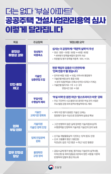 [아유경제=조명의 기자] 조달청은 `공공주택 건설사업관리용역 심사 관련 규정 2종`을 전면적으로 개정해 이달 10일부터 본격 시행한다고 최근 밝혔다. 공공건설 현장의 입찰 비리와 부실 문제를 해결하고 공공주택 건설사업관리용역의 질적 수준을 높이기 위해서다.