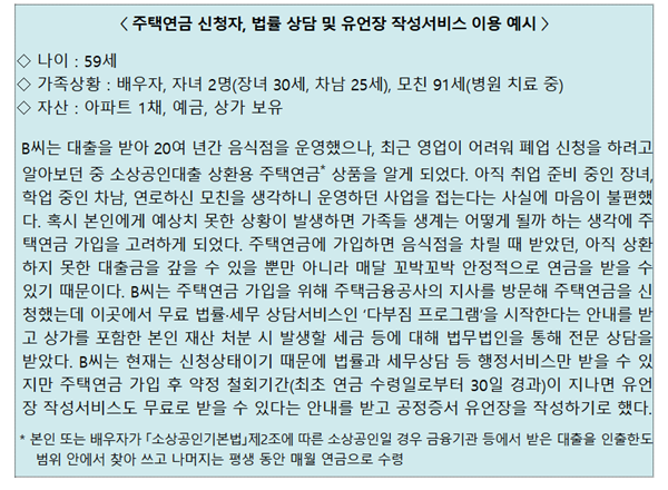 프로그램은 ▲유언장ㆍ임의후견계약서 작성 ▲상속ㆍ증여 ▲담보주택의 재건축 등에 따라 고객들이 궁금해하는 법률과 세무 관련 내용에 대해 법무법인을 통해 무료로 상담받을 수 있도록 했다. 예산 소진 때까지 운영된다.