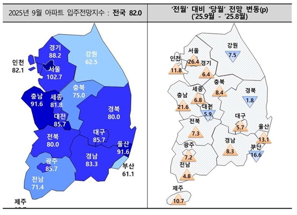 수도권 입주전망지수는 91로 전월(76.1)과 비교해 14.9p 상승했다. 서울은 102.7로 전월(76.3)보다 26.4p 올라 상승폭이 컸다. 인천은 82.1로 전월(70.3)보다 11.8p, 경기는 88.2로 전월(81.8)보다 6.4p 각각 상승했다.