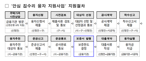 사업 참여를 위해서는 먼저 융자상품을 취급하는 신한은행 지점에 방문해 융자 가능여부와 금액을 확인한 후, 신청기간 내 자치구 신청 접수처에 구비서류를 제출하면 된다. 융자상품 취급 신한은행 지점과 자치구 신청 접수처, 신청서 양식은 온라인에서 `집수리닷컴` 누리집에서 확인할 수 있다.