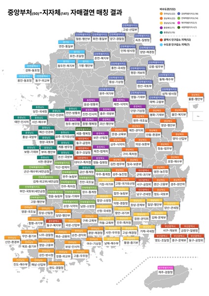 한편, 행안부는 중앙부처를 대상으로 자매결연 희망 지자체에 대한 수요조사를 하고, 각 부처가 부처 특성 등을 고려해 제출한 희망 지역에 기반해 50개 중앙부처와 141개 시ㆍ군ㆍ구 간 매칭을 모두 완료했다.