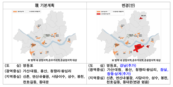 변경안에 따라 도시정비형 재개발 대상 지역은 동북권 창동ㆍ상계와 동남권 강남ㆍ잠실까지 확대된다. 기존에는 도심은 영등포, 광역 중심은 가산ㆍ대림, 용산, 청량리ㆍ왕십리만 재개발 대상에 포함됐다. 지역 정비 활성화를 위해 최소 필지, 저밀 이용, 신축 비율 기준을 삭제하고, 법정기준 노후도가 확보된 경우 정비구역으로 지정하는 등 중심지 고도화에도 힘쓸 계획이다.