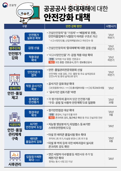 [아유경제=조명의 기자] 조달청은 반복되는 건설현장 안전사고를 예방하고 국민이 안심할 수 있는 공공시설물을 건립하기 위해 건설안전 강화 대책을 추진한다고 이달 18일 밝혔다.