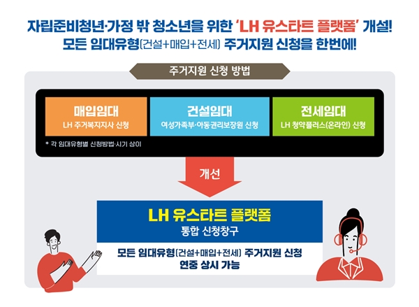 LH는 이달 23일부터 자립준비청년과 가정 밖 청소년을 위한 새로운 통합 지원 창구인 `LH 유스타트 주거 지원 플랫폼`을 운영한다. 그간 임대유형별 신청 방법, 접수 기간 등이 달라 불편했던 점을 반영해 해당 플랫폼을 통해 기간 제한 없이 손쉽게 신청할 수 있도록 하고 제출 서류를 간소화해 신청 편의를 높였다.