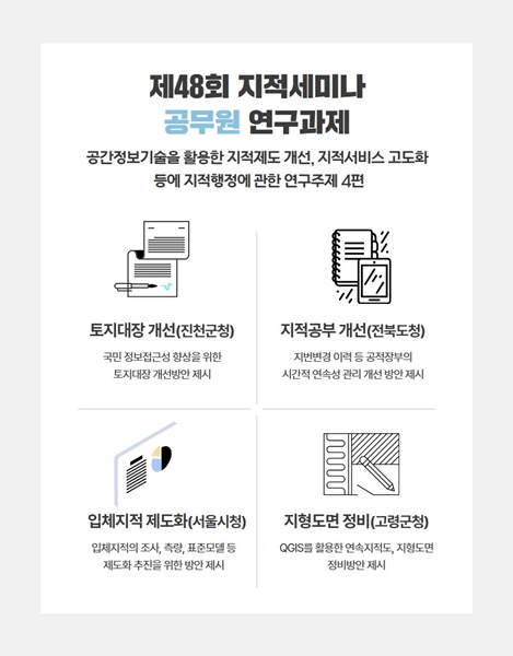 올해로 제48회를 맞이하는 지적세미나는 정부와 지자체, LX, 학계 등이 함께 지적ㆍ공간정보 분야 발전을 위한 제도 개선과 신기술 활용, 대국민 서비스 향상 방안 등을 찾는 연례 학술행사다.