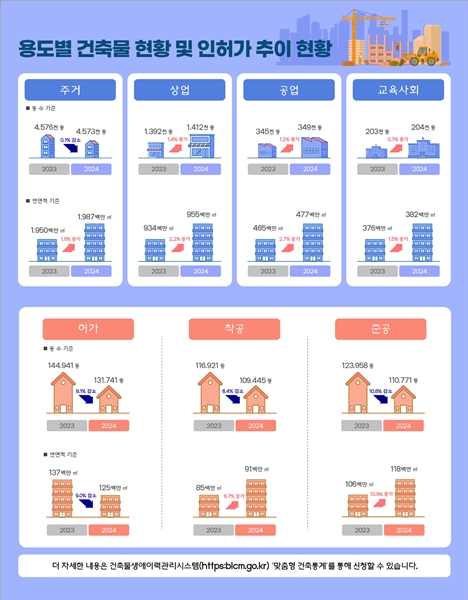 한편, 지난해 전국 건축물 통계는 지난 1월 발표한 `건축통계 정확도 향상을 위한 집계 방식 개선 방안`을 반영한 결과다. 매월 국가통계포털(KOSIS) 등에 공표된 이후 발생하는 설계변경, 허가취소 등을 반영하기 위해 익년에 변동분을 일괄 보정해 확정하는 방식으로 변경했다. 연 단위 통계 공표 시기도 3월에서 9월로 변경돼 앞으로 매년 9월에 발표될 예정이다.