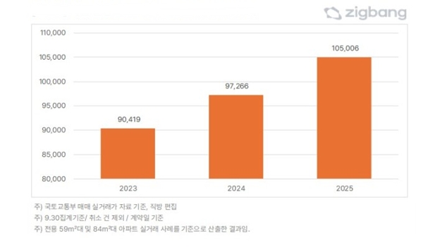 반면 국민평형인 전용면적 84㎡ 아파트 매매가격 상승 폭은 줄어드는 모습이다. 2023년 11억6597만 원에서 지난해 12억7591만 원, 올해 13억8086만 원을 기록하며 상승했으나, 상승 폭은 지난해 9.4%에서 올해 8.2%로 다소 둔화됐다.