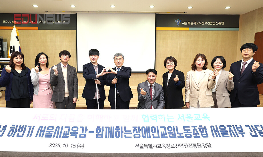 [에듀뉴스] 정근식 서울특별시교육감이 함께하는장애인교원노동조합(장교조)와 15일 오후 종로구 보건안전진흥원에서 ‘흰지팡이의 날’을 맞아 ‘서로의 다름을 이해하고 함께 협력하는 서울교육’을 주제로 2025년 하반기 소통 간담회를 진행하고 기념촬영을 하고 있다.