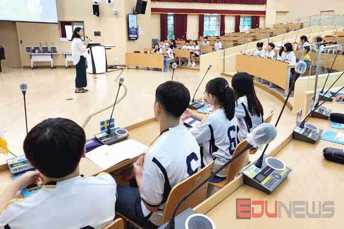 ‘모의유엔’ 체험활동에서는 학생들이 ‘아동 인권 보호를 위한 협력 방안’을 주제로 유엔 회원국 대표가 되어 국제 사회 현안을 논의하고 해결책을 모색하며 글로벌 리더에게 필요한 국제 감각과 문제 해결 능력을 기른다.