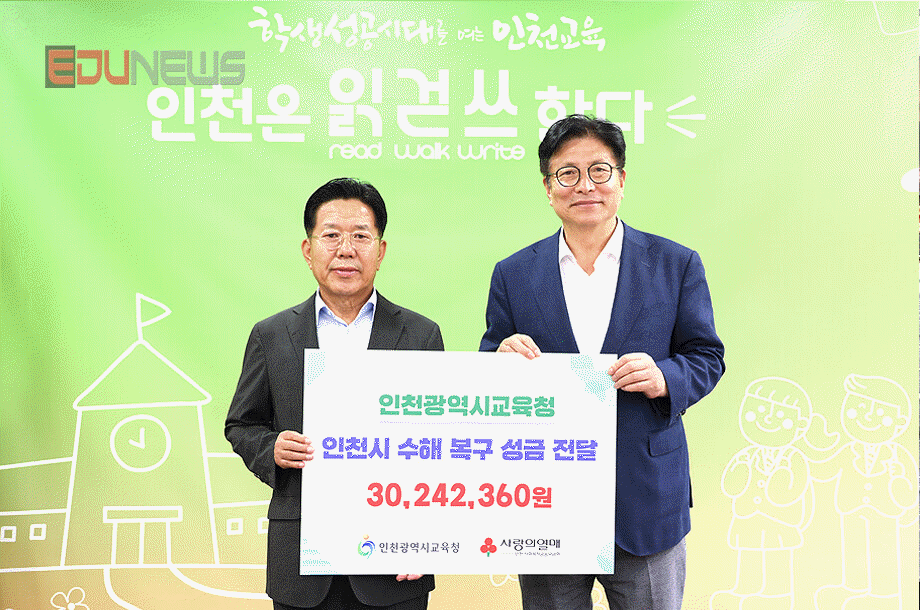 [에듀뉴스] 인천광역시교육청(교육감 도성훈)은 최근 인천에 발생한 기록적인 집중호우로 피해를 입은 이재민들을 돕기 위해 성금 30,242,360원을 사회복지공동모금회에 전달했다.