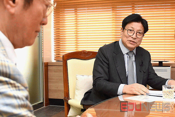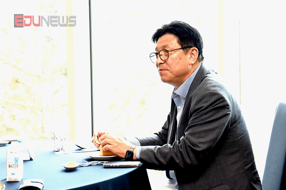 [에듀뉴스] 22일 오후 2시 30분 강원특별자치도 강릉 씨마크호텔 컨벤션센터 ‘호수홀’에서 열린 전국시도교육감협의회(교육감협)에 앞서 ‘하늘홀’에서 열린 차담회에서 김광수 제주특별도교육감이 전국 소년체전과 관련해 “체전에 출전하는 선수들을 초청한적이 있었다”면서 “한 고3학생이 교육감실에서 ‘여기가 뭐하는 데에요’, ‘여기서 뭐하는 거에요’ 등등 처음온 교육감실에 대해 궁금한 것이 많았었다”고 회상하며 설명하고 있다.