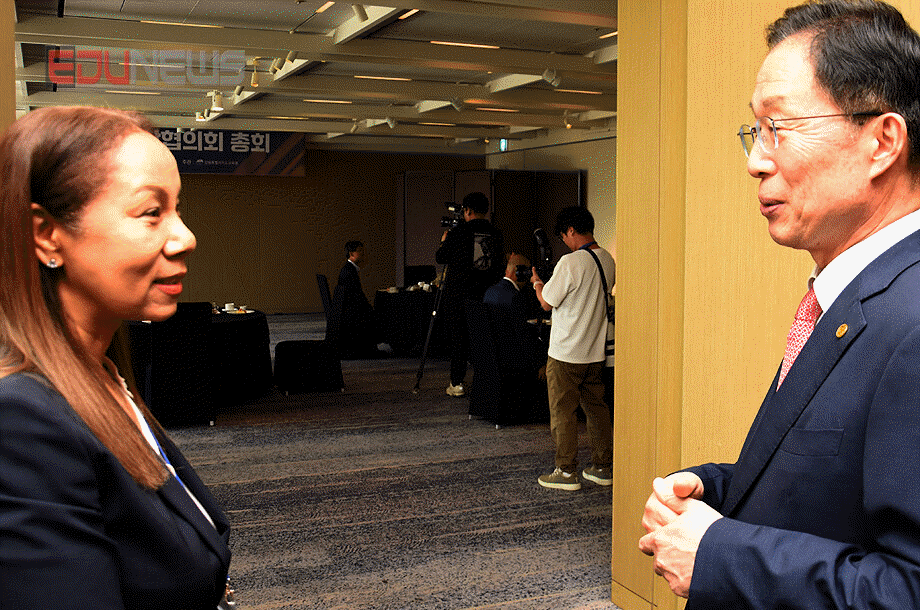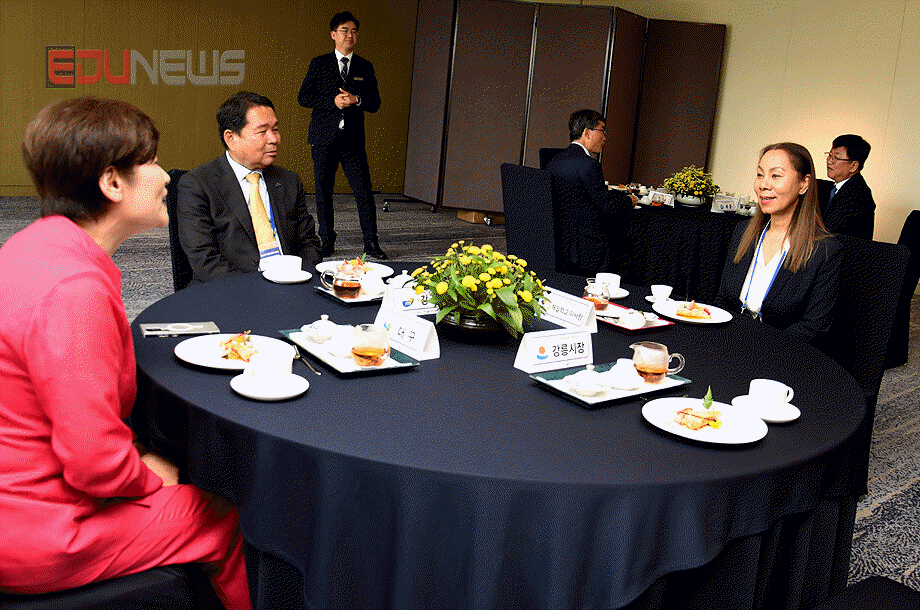 [에듀뉴스] 22일 오후 2시 30분 강원특별자치도 강릉 씨마크호텔 컨벤션센터 ‘호수홀’에서 열린 전국시도교육감협의회(교육감협)에 앞서 ‘하늘홀’에서 열린 차담회에서 임태희 경기도교육감과 가수 인순이가 국제학교에 대해 의견을 나누고 있다.