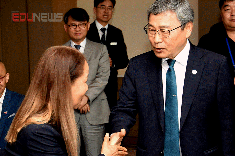 [에듀뉴스] 22일 오후 2시 30분 강원특별자치도 강릉 씨마크호텔 컨벤션센터 ‘호수홀’에서 열린 전국시도교육감협의회(교육감협)에 앞서 ‘하늘홀’에서 열린 차담회에서 김석준 부산광역시교육감과 가수 인순이가 인사를 나누고 있다.