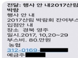 그러나 최근 높아진 산림문화박람회의 인기에 편승하여 박람회 입점을 위한 고비용을 요구하는 허위 문자메시지가 무차별적으로 유포되고 있어 박람회에 참가하고자 하는 임산물 가공업체와 산림산업 관련 사업자 및 단체의 각별한 주의가 요구된다는 것.