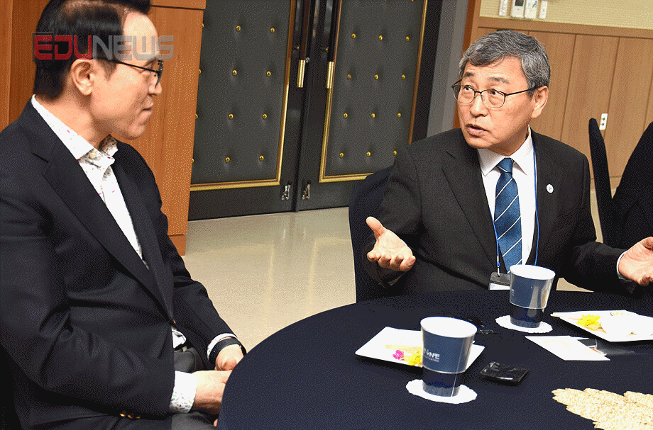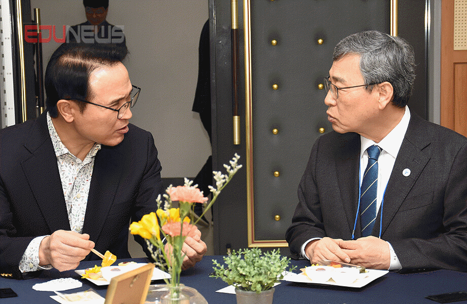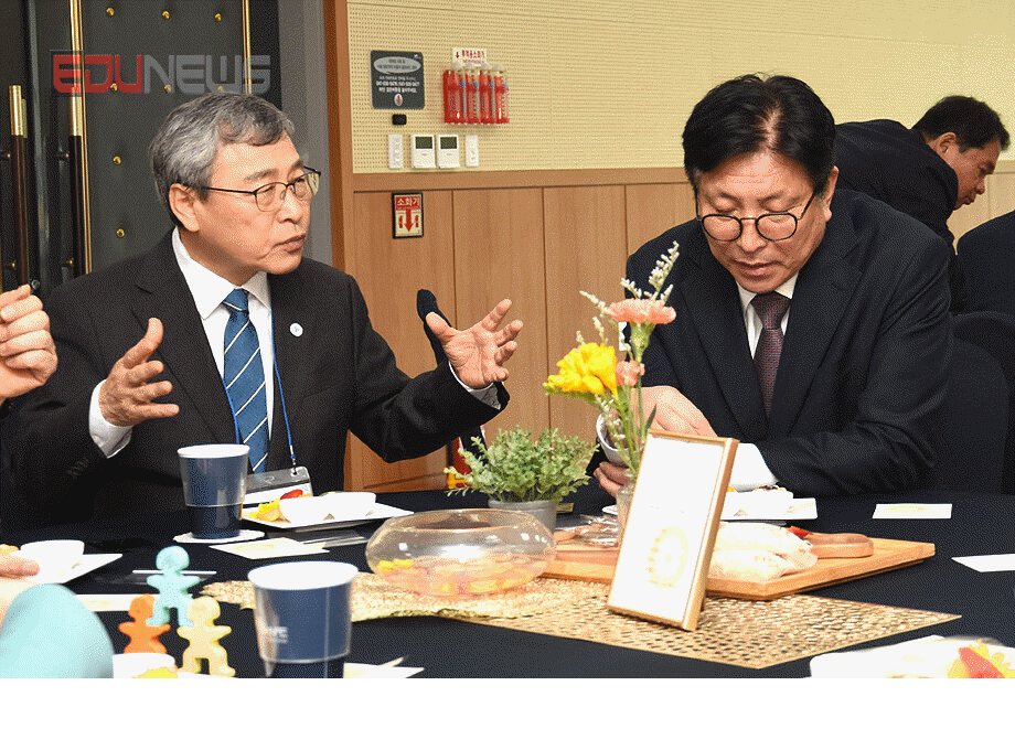 [에듀뉴스] 전국시도교육감협의회(교육감협, 회장 강은희 대구광역시교육감) 총회가 열리기에 앞서 교육감들의 차담회에서 김대중 전라남도교육감이 강은희 회장에게 유학생의 취업비자 확대를 위한 제도 개선에 대해 설명하고 있다.