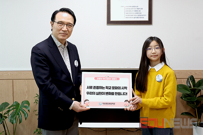 행사에서는 다산한강초 학교 구성원의 인터뷰 영상 시청과 학생, 학부모, 교직원 대표가 함께 교육공동체 약속을 선포하며 실천 의지를 다졌다. 이후 임 교육감이 ‘상호존중 학교 문화 조성 자율 운영교’ 현판을 수여해 행사의 특별한 의미를 더했다.