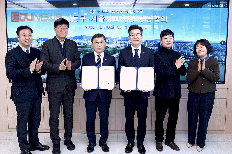 [에듀뉴스] 정근식 서울특별시교육감과 정원오 성동구청장이 30일 오전 서울 성동구청에서 적정규모학교 육성과 지역사회의 폭넓은 공감대 형성을 위한 성동구 교육발전 방안 공론화 추진 협약을 체결한 후 기념촬영하고 있다. ⓒ 에듀뉴스 (https://www.edunewson.com/) 무단전재 및 재배포 금지