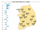지방(0%)은 시ㆍ도별로 부산(0.03%), 대전(-0.02%), 대구(-0.06%), 충남(0.02%), 충북(0%), 강원(0.01%), 광주(-0.01%), 울산(0.05%), 세종(0.05%), 전남(-0.01%), 전북(0.02%), 경남(0.01%), 경북(-0.02%), 제주(-0.02%) 등의 결과를 보였다. 세종은 상대적 거주여건 양호한 새롬ㆍ반곡동 위주로 상승하며 상승 전환했다.ⓒ AU경제(http://www.areyou.co.kr/) 무단전재 및 재배포금지