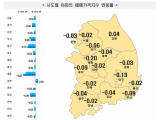 서울은 ▲은평(-0.02%) ▲노원(-0.01%) ▲성북(-0.01%) ▲송파(-0.01%) ▲영등포(-0.01%) 순으로 하락했고, ▲서초(0.03%) ▲마포(0.01%)는 상승했다. 신도시는 ▲산본(-0.04%) ▲분당(-0.01%) 등이 내렸고 ▲파주운정(0.02%)은 올랐다. 경기ㆍ인천은 ▲안산(-0.05%) ▲부천(-0.02%)이 떨어진 반면 ▲파주(0.02%) ▲인천(0.02%)은 올랐다.