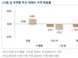 신도시는 ▲일산(-0.09%) ▲평촌(-0.06%) ▲분당(-0.01%) 순으로 떨어졌으며 그 외 지역은 가격 변동이 없었다. 경기ㆍ인천은 ▲광명(0.08%) ▲김포(0.08%) ▲화성(0.08%) ▲과천(0.07%) 등은 상승했고 ▲평택(-0.06%) ▲의정부(-0.06%) ▲양주(-0.04%) ▲오산(-0.04%) 등은 하락했다.