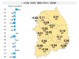 지방(0%)은 시ㆍ도별로 부산(0.05%), 대전(-0.04%), 대구(-0.03%), 충남(-0.02%), 충북(0.03%), 강원(-0.02%), 광주(0.03%), 울산(0.07%), 세종(-0.01%), 전남(-0.03%), 전북(-0.04%), 경남(-0.01%), 경북(-0.01%), 제주(-0.03%) 등의 결과를 보였다. 세종은 지역별 혼조세 보이며 고운ㆍ다정ㆍ보람동 위주로 하락했다.ⓒ AU경제(http://www.areyou.co.kr/) 무단전재 및 재배포금지