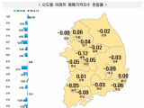 지방(-0.04%)은 시ㆍ도별로 부산(-0.06%), 대전(-0.05%), 대구(-0.09%), 충남(-0.05%), 충북(-0.02%), 강원(-0.02%), 광주(-0.05%), 울산(0%), 세종(-0.12%), 전남(-0.08%), 전북(0.01%), 경남(-0.03%), 경북(-0.03%), 제주(-0.05%) 등의 결과를 보였다.