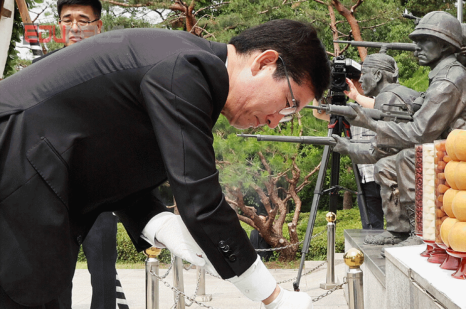 [에듀뉴스] 윤건영 충청북도교육감이 6일, 오창 중앙근린공원 충혼탑에서 열린 제70회 현충일 기념식에 참석해 도교육청 간부공무원들과 헌화 및 분향을 하고 있다.