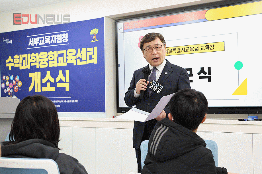 [에듀뉴스] 정근식 서울특별시교육감이 31일 오전 서울 마포구 성원초등학교 내 새롭게 문을 연 서부수학과학융합교육센터 개소식에 참석해 인사말을 하고 참여 학생들을 격려하며 ‘엄지척’을 하고 있다.